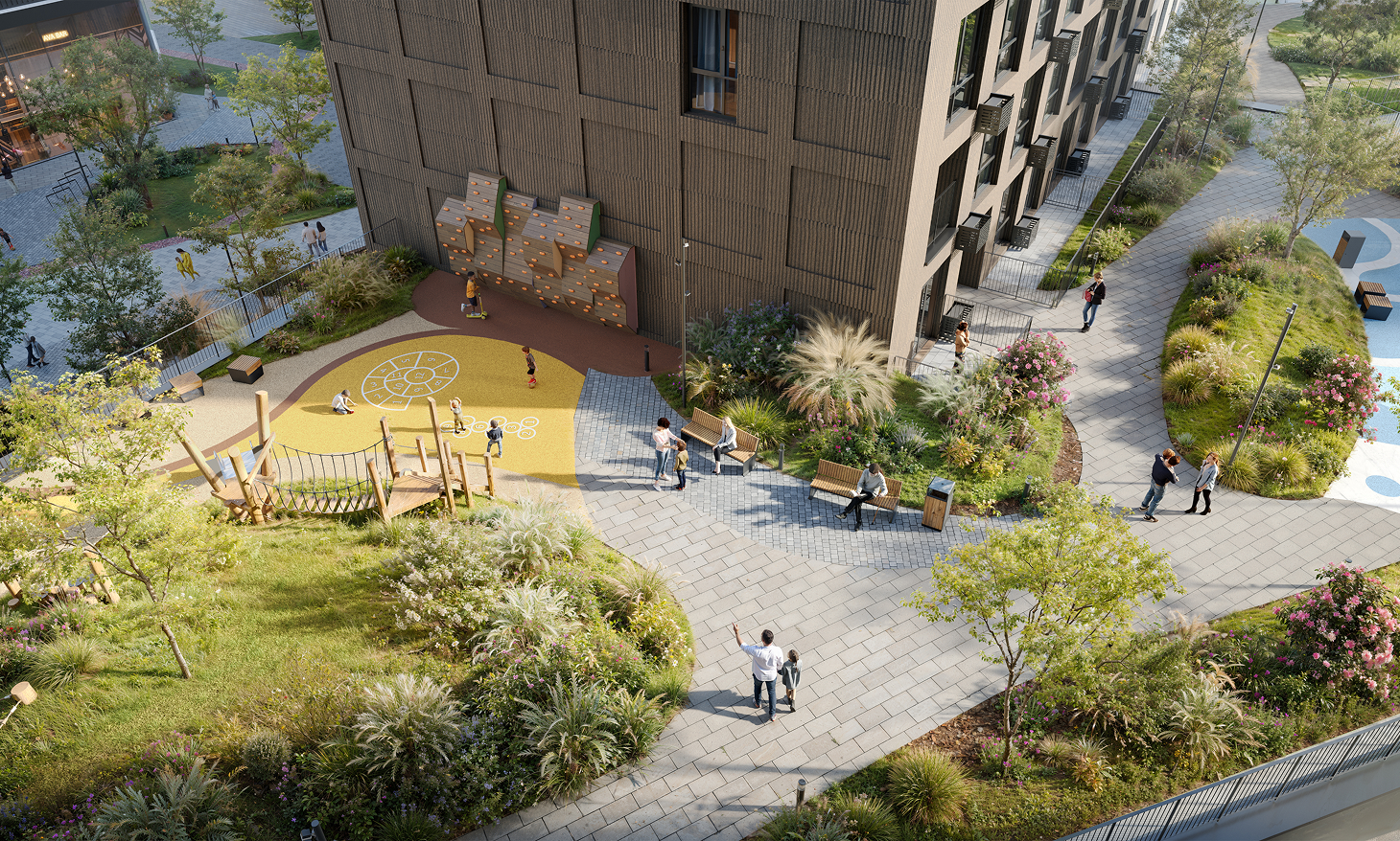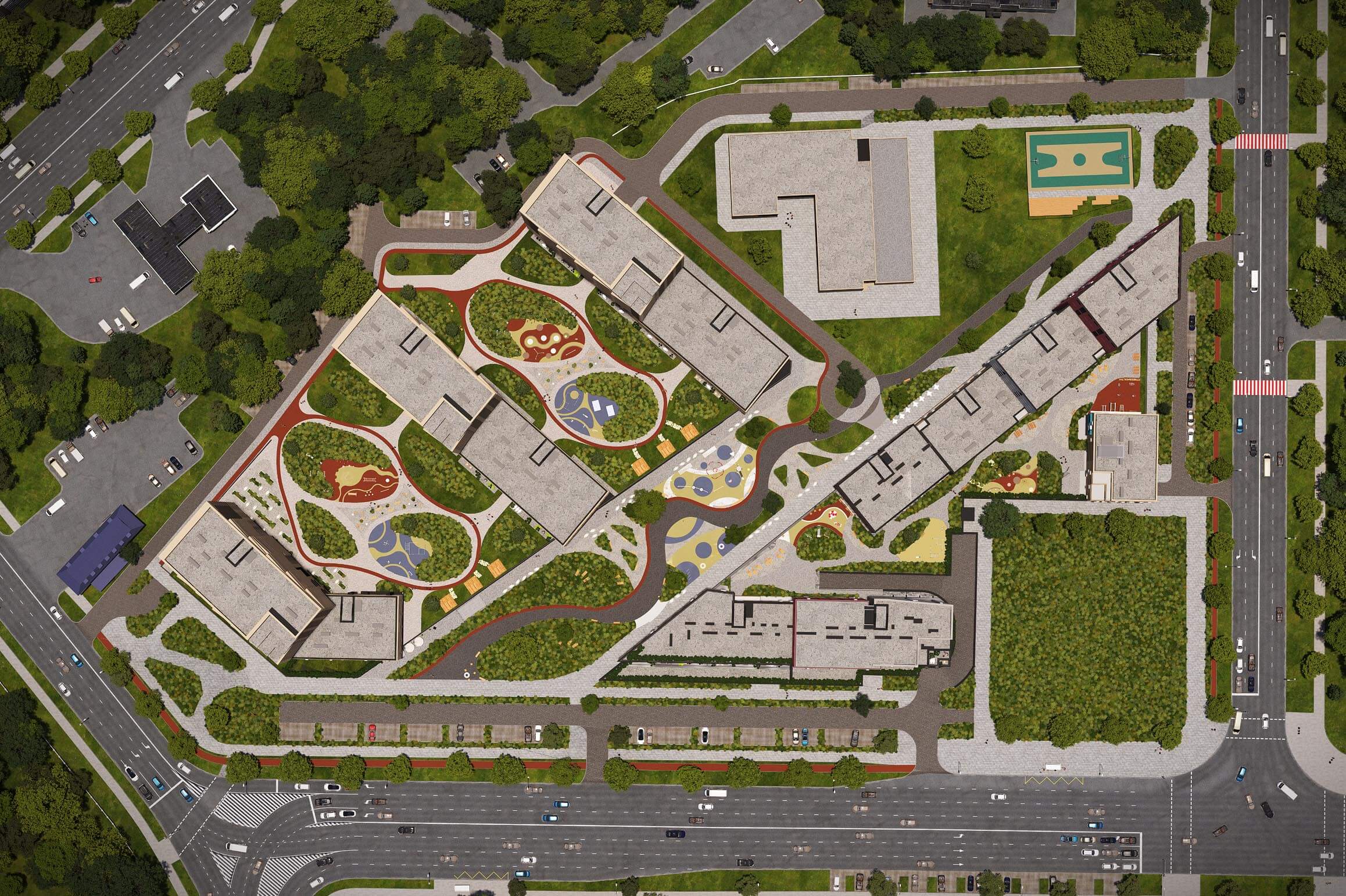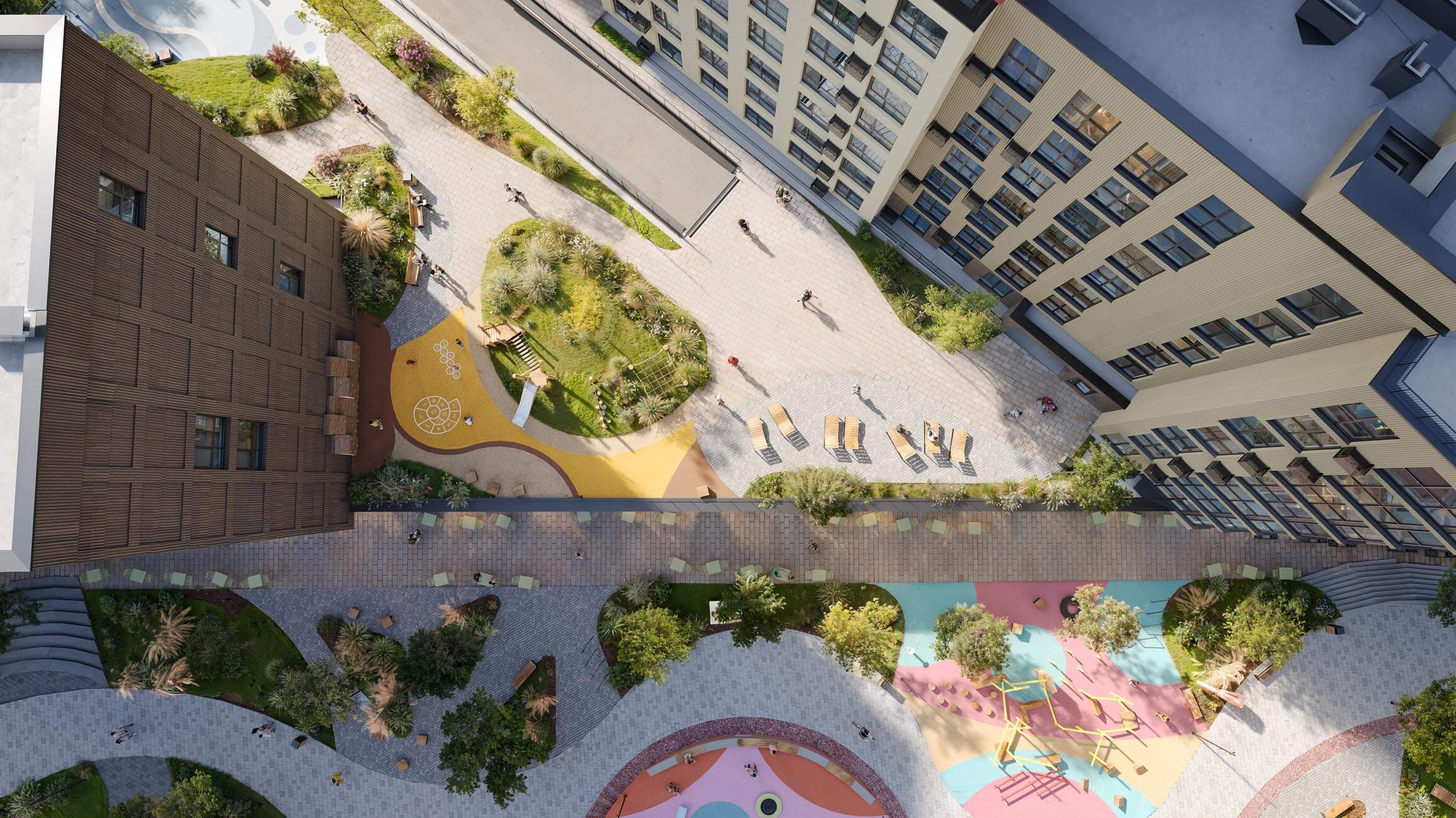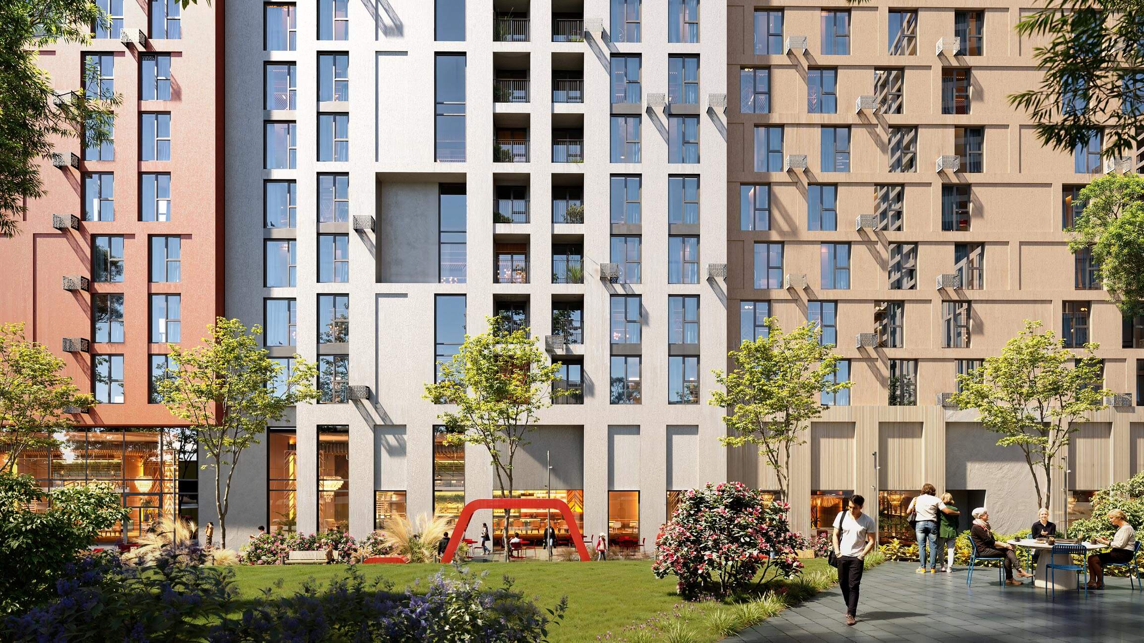 Захищені двори, природне освітлення, зонування, що знижує стрес і тривожність.
